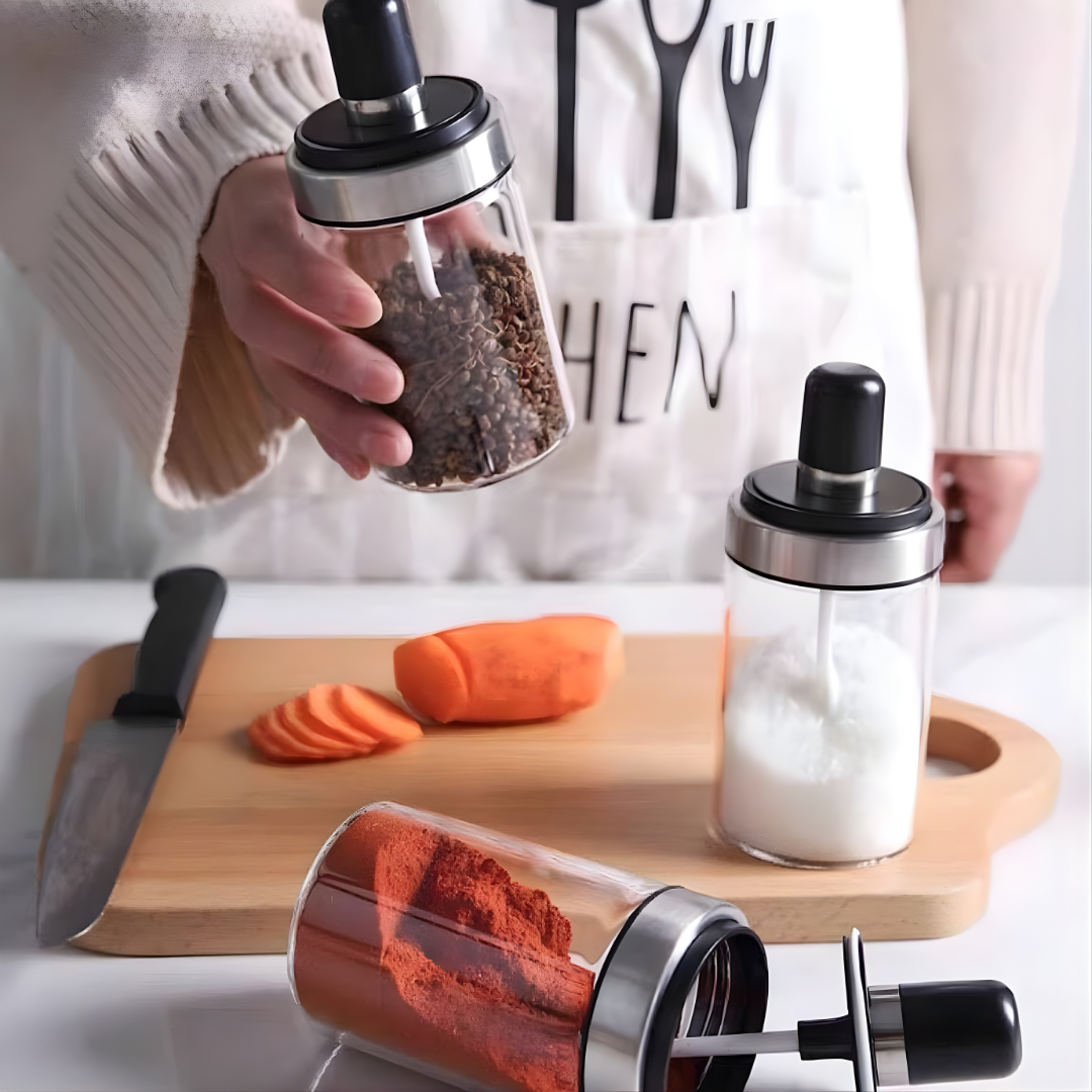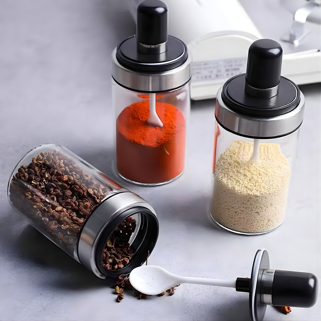 برطمان توابل زجاجي بملعقة مدمجة وغطاء محكم – شفاف مع حافة ستانلس