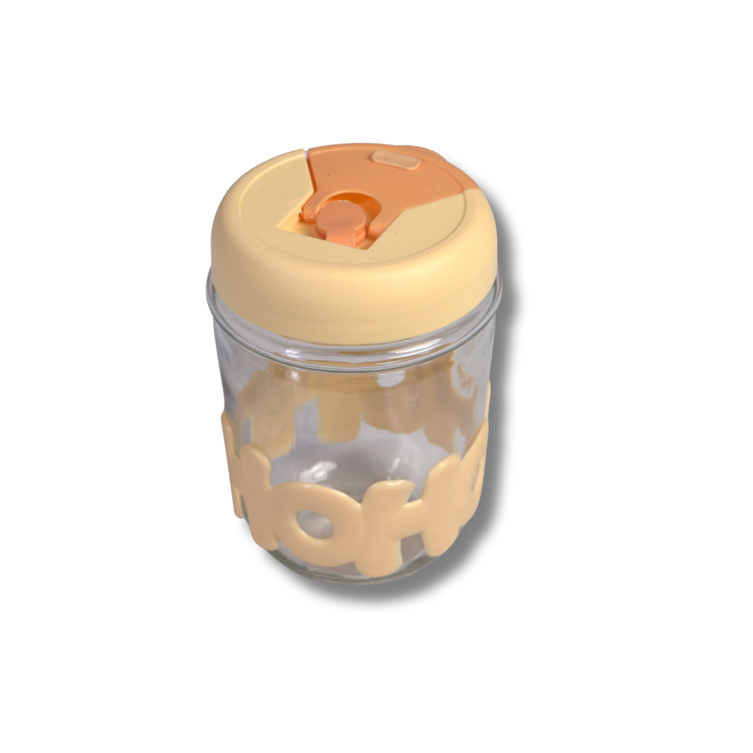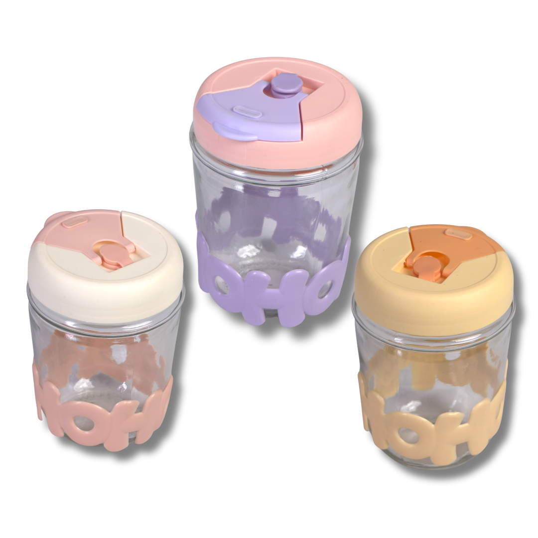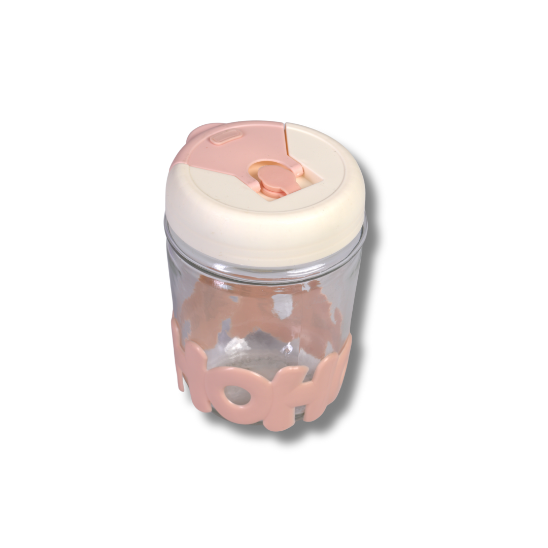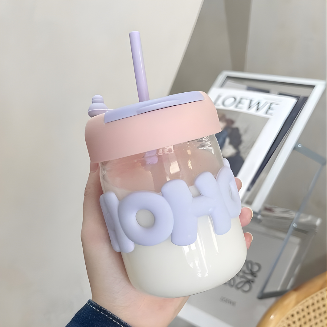 كوب زجاجي بشفّاطة وغطاء سيليكون بحروف مجسّمة – لون وردي/بنفسجي