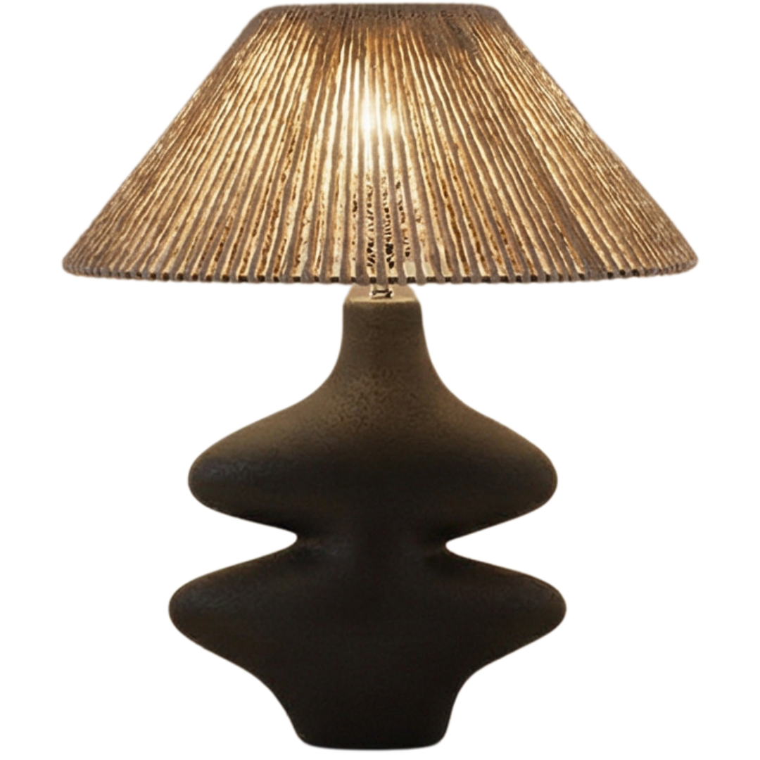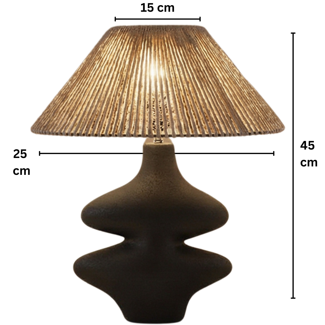 أباجورة ديكور بتصميم عصري راقٍ، تجمع بين قاعدة فخار باللون الأسود المطفي وشِـدة مصنوعة من الخيوط والأقمشة الطبيعية، لتوفر إضاءة دافئة تضيف لمسة فخامة وهدوء للمكان. اللون الأسود يمنحها طابعًا عصريًا قويًا يناسب الديكورات الحديثة والمينيمال.