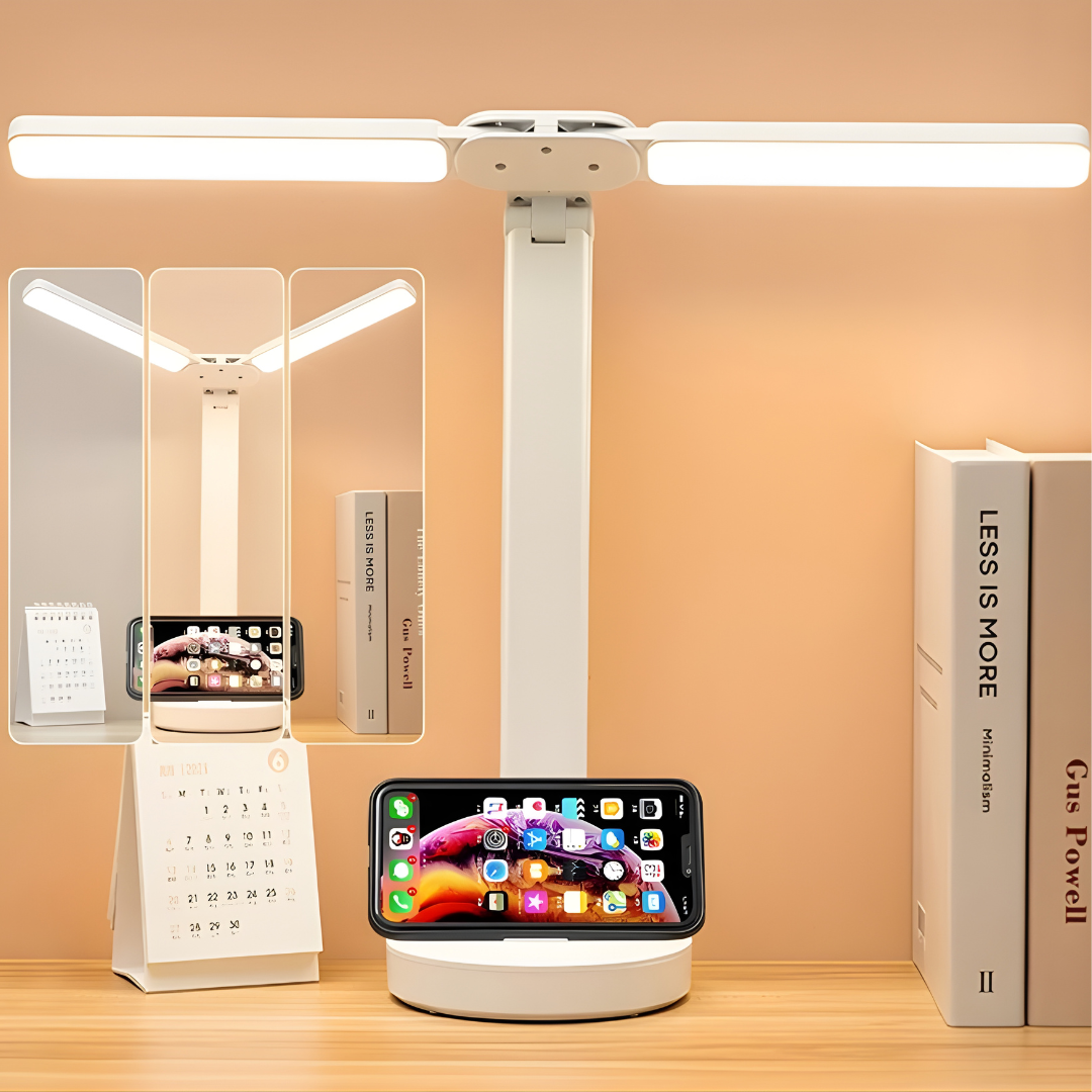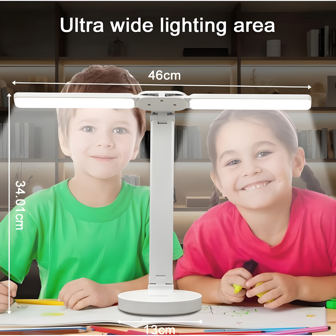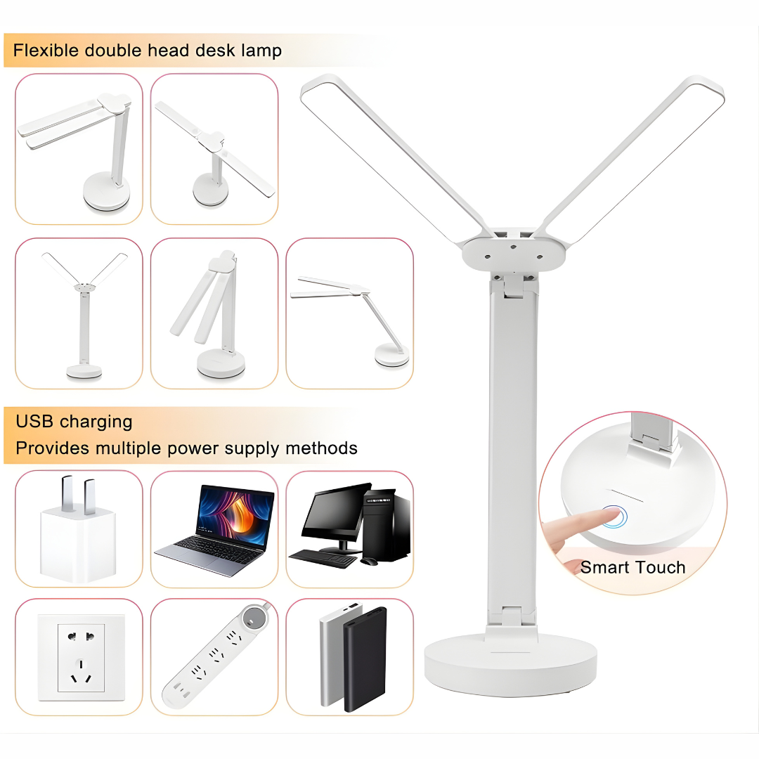 إضاءة عريضة ومريحة للعين تغطي سطح المكتب بالكامل. ذراعان LED قابلان للدوران والطي مع تحكّم باللمس وتعتيم سلس، تعمل ببطارية قابلة للشحن أو عبر USB لتناسب الدراسة والقراءة والعمل في البيت أو المكتب.