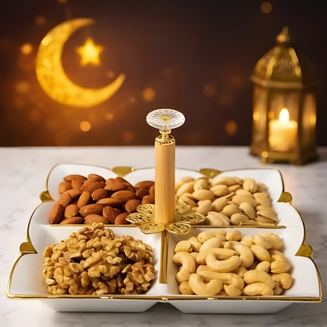قطعة تقديم فاخرة تجمع بين الخزف الأبيض اللامع والحواف الذهبية مع مقبض علوي أنيق بلمسة كريستال. مثالية لعزومات رمضان والضيافة اليومية لعرض المكسرات والتمور والحلويات في شكل مرتّب وجذاب.