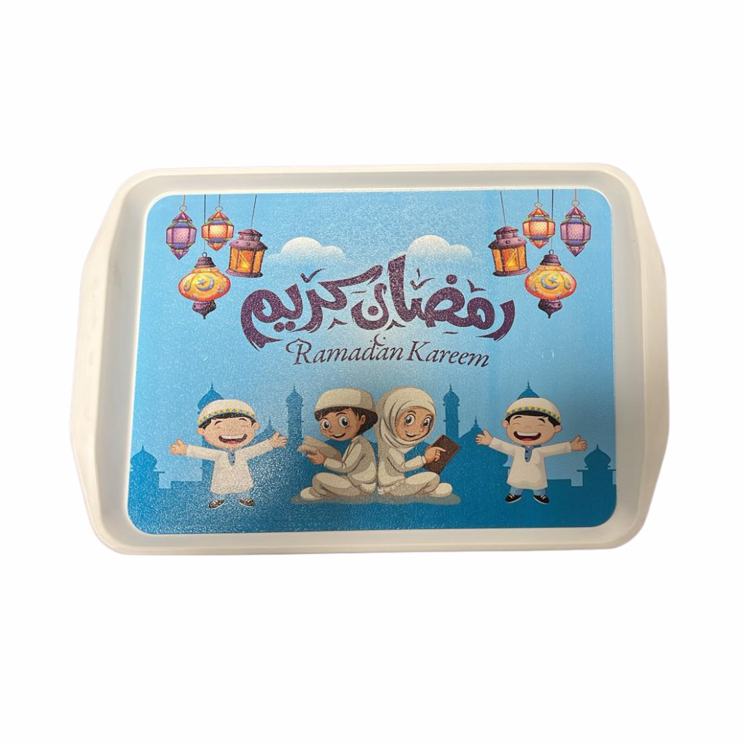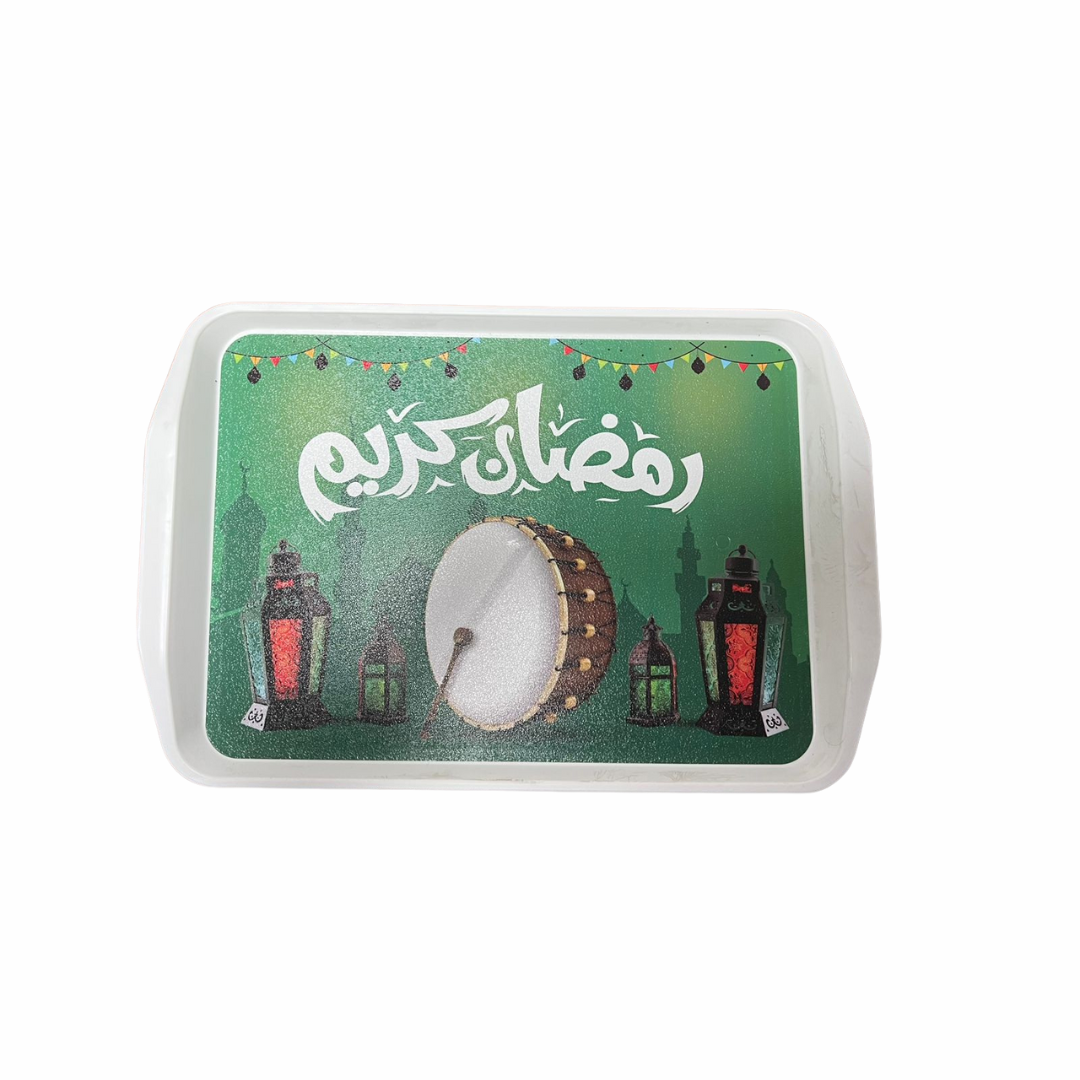 صينية تقديم رمضانية أنيقة بطبعات عربية مبهجة تضيف جو الاحتفال على سفرتك في الإفطار والسحور، مناسبة للتقديم اليومي والضيافة.