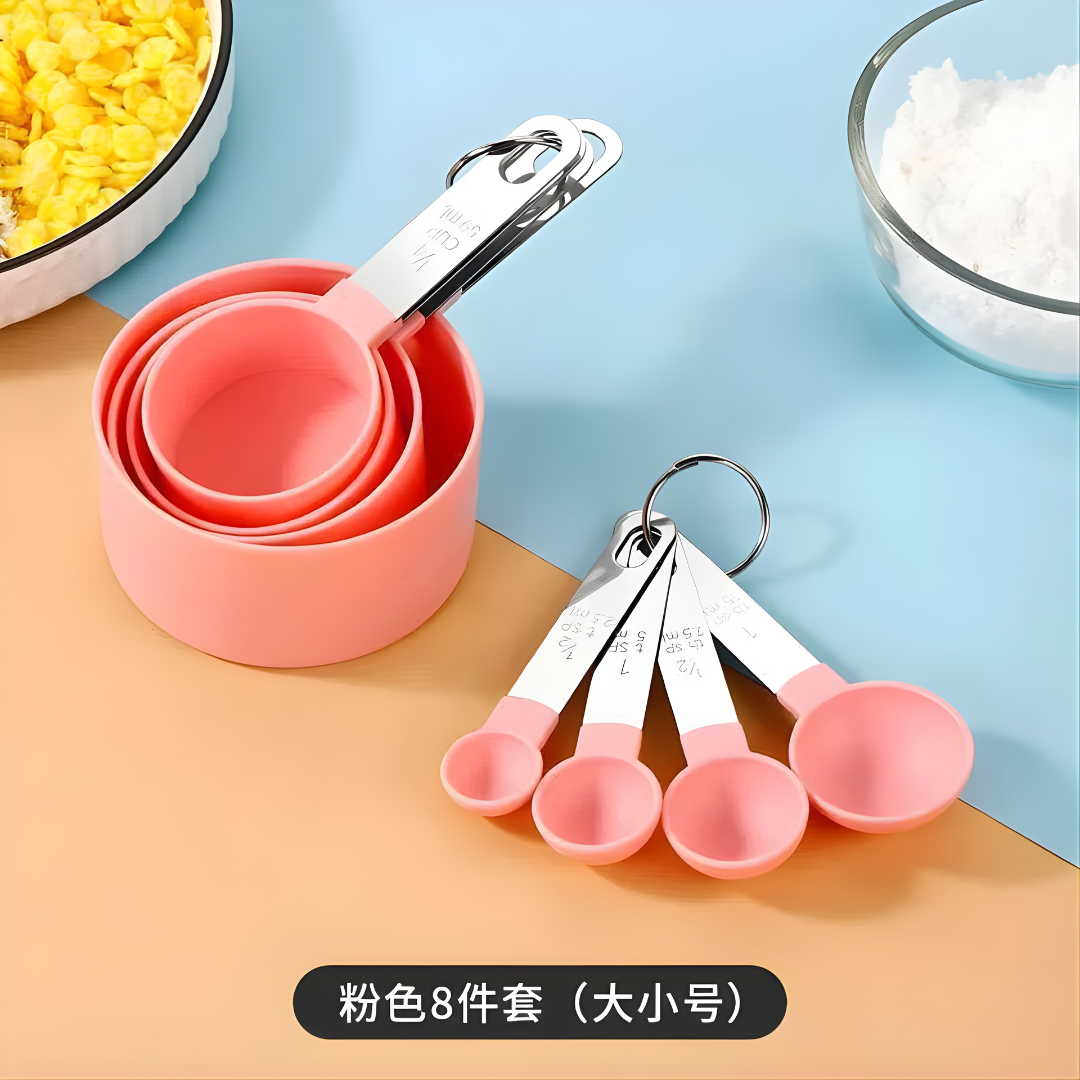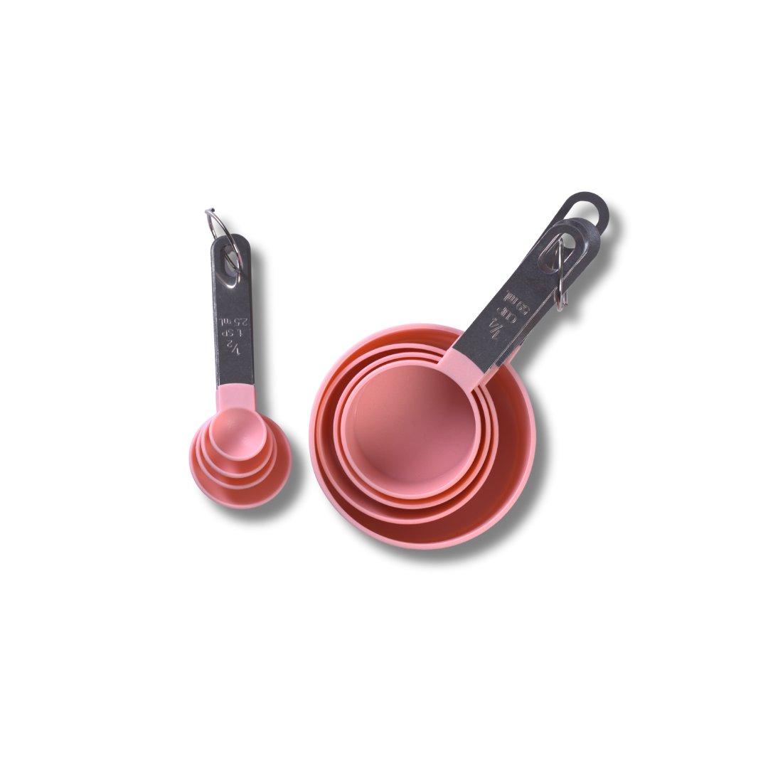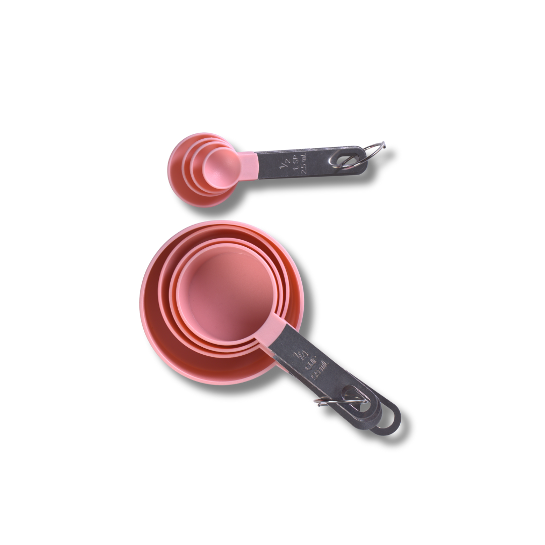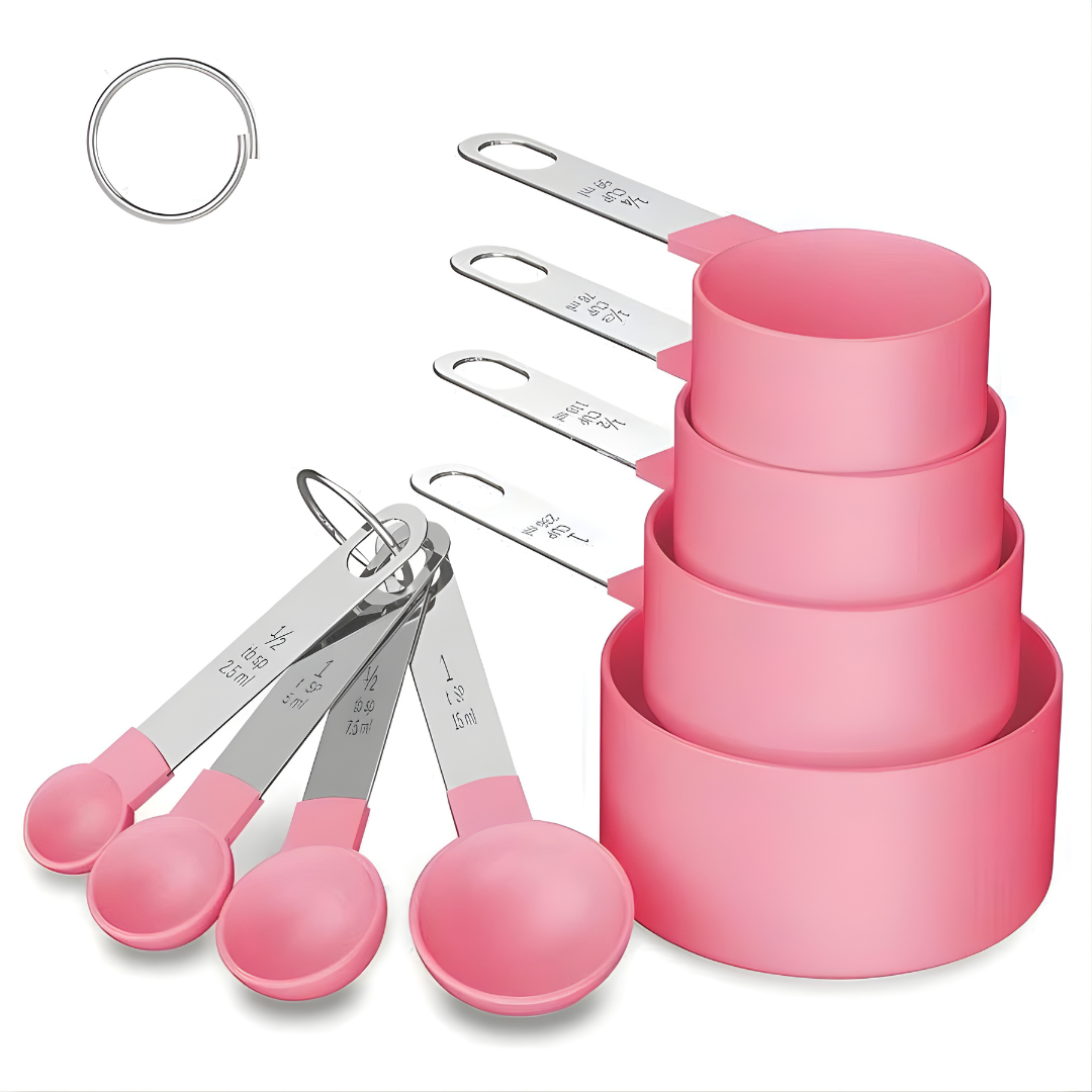 طقم أكواب وملاعق قياس 8 قطع – مقبض ستانلس ستيل ورؤوس بلاستيك قابلة للتكديس (وردي)