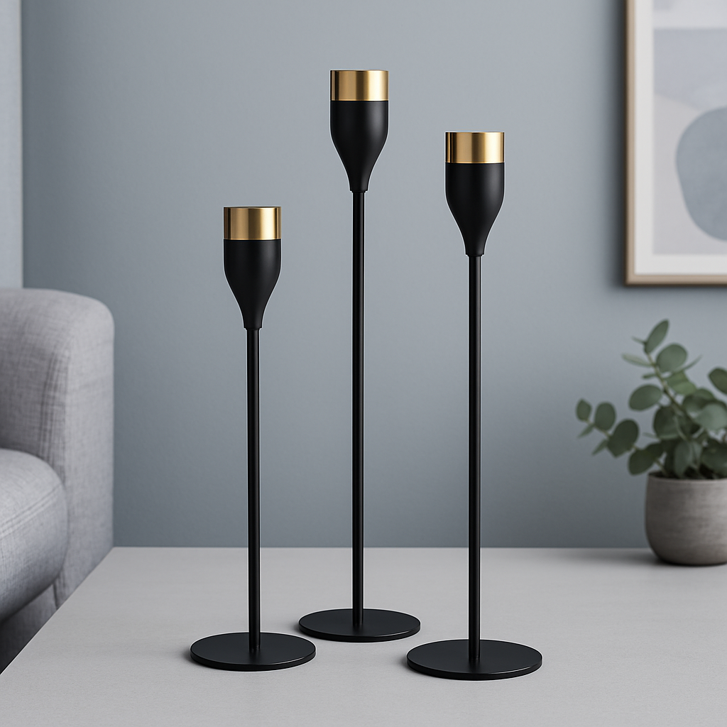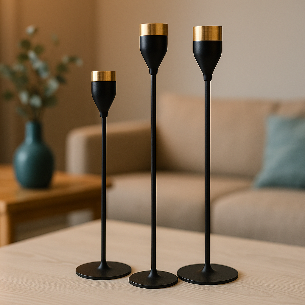 مجموعة شمعدانات معدنية بتصميم فاخر بالأسود والذهبي – لمسة ديكور عصرية تمنح المكان أناقة استثنائية