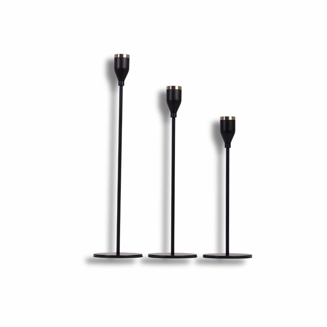 أضف لمسة فنية راقية لديكور منزلك مع مجموعة الشمعدانات المعدنية الفاخرة بتصميم الأسود المطفي مع لمسة الذهب المميز. تصميم طويل، نحيف، وبسيط يعكس روح الفخامة الحديثة ويحوّل أي مساحة لزاوية ديكور مميزة.