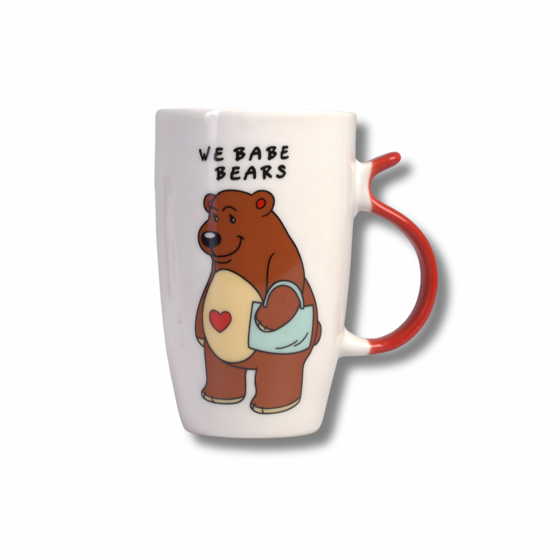 مج سيراميك أبيض بطبعة دب لطيف ومقبض أحمر – شكل لاتيه طويل